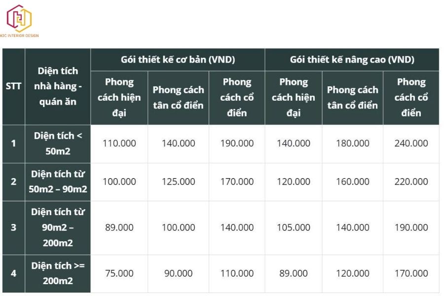 Cập nhật giá thiết kế nhà hàng trọn gói tại TP.HCM 2025. H2C mang đến giải pháp tiết kiệm, thiết kế chuyên nghiệp, miễn phí bản vẽ khi thi công.