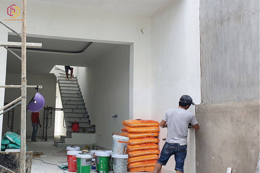 Đội ngũ H2C bắt đầu triển khai thi công theo đúng bản vẽ đã duyệt. Các hạng mục từ phần thô (xử lý chống thấm, điện – nước, sơn, trần thạch cao, lát sàn) cho đến phần hoàn thiện (lắp đặt nội thất, trang trí) đều được thực hiện tuần tự. Trong suốt quá trình, H2C luôn có đội ngũ giám sát kỹ thuật trực tiếp tại công trình để đảm bảo chất lượng thi công, hạn chế tối đa phát sinh.