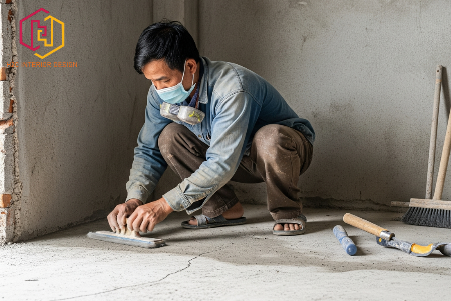 Xử lý các khuyết tật: Đục bỏ các lớp vữa cũ yếu, trám vá các vết nứt, lỗ rỗ bằng vật liệu chuyên dụng để tạo ra một bề mặt bằng phẳng, chắc chắn.