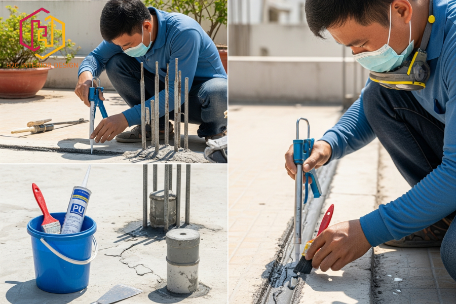 Xử lý khe co giãn: Khe co giãn là nơi kết nối giữa các mảng bê tông, dễ bị nứt khi công trình thay đổi nhiệt độ. Chúng tôi sẽ sử dụng các loại băng trương nở, keo trám khe hoặc vật liệu chuyên dụng có khả năng đàn hồi cao để lấp đầy, giúp các khe này co giãn linh hoạt mà vẫn đảm bảo kín nước.