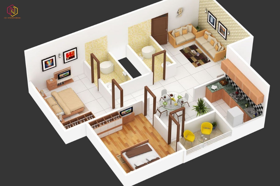 Sau khi khảo sát, H2C tiến hành lập bản vẽ chi tiết và phối cảnh 3D để khách hàng dễ dàng hình dung trước không gian mới của căn hộ. Nhờ đó, gia chủ có thể điều chỉnh, góp ý và thống nhất ý tưởng trước khi bước vào thi công, tránh tình trạng “thi công một kiểu – ra một kiểu”.