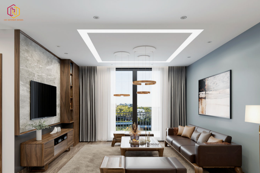 Không gian phòng khách được thiết kế theo phong cách tối giản – hiện đại, hạn chế chi tiết rườm rà nhưng vẫn đảm bảo sự tinh tế. H2C chú trọng tối ưu ánh sáng tự nhiên bằng cửa kính lớn, kết hợp rèm hai lớp để điều chỉnh độ sáng linh hoạt. Nội thất chủ yếu là sofa bọc vải/da gọn gàng, bàn trà nhỏ xinh, kệ tivi treo tường nhằm tiết kiệm diện tích và tạo cảm giác rộng thoáng. Đây cũng là không gian gắn kết gia đình, tiếp khách và thể hiện phong cách sống của gia chủ.