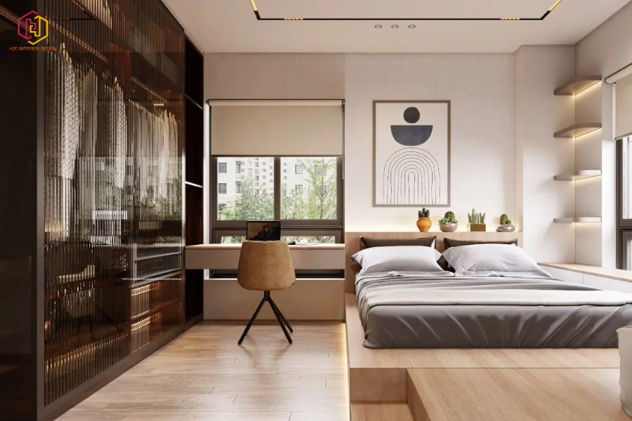 Phòng ngủ được cải tạo theo hướng thoáng đãng, tiện nghi và thư giãn tối đa. H2C ưu tiên sử dụng tủ âm tường để tiết kiệm diện tích, giường thông minh tích hợp hộc chứa đồ giúp không gian gọn gàng. Gam màu chủ đạo thường là màu trung tính, pastel hoặc gỗ tự nhiên, mang lại sự ấm áp và giúp gia chủ dễ dàng đi vào giấc ngủ. Ngoài ra, ánh sáng trong phòng ngủ được bố trí nhiều lớp: đèn trần, đèn đọc sách, đèn ngủ… nhằm tạo không gian ấm cúng, đa dạng công năng.