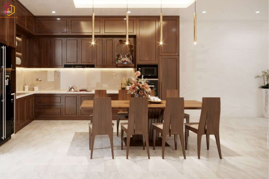 Khu vực bếp – ăn được bố trí liên thông để tiết kiệm diện tích và tăng tính kết nối. H2C sử dụng tủ bếp gỗ công nghiệp chống ẩm hoặc nhựa cao cấp với hệ thống ray trượt, bản lề giảm chấn bền bỉ. Mặt bếp có thể lựa chọn đá nhân tạo/quartz dễ vệ sinh và có tính thẩm mỹ cao. Đặc biệt, nhiều căn hộ được thiết kế thêm quầy bar mini hoặc đảo bếp vừa làm điểm nhấn, vừa là nơi gia đình sum họp, thưởng thức bữa ăn ấm cúng. Không gian ăn uống thường đi kèm bộ bàn ghế nhỏ gọn, kết hợp ánh sáng đèn thả để tăng sự sang trọng.