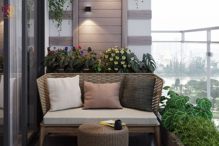 Ban công và logia vốn là những góc nhỏ nhưng lại có thể biến thành không gian xanh và thư giãn. H2C thường cải tạo theo hướng bố trí tiểu cảnh cây xanh, giàn hoa leo hoặc thảm cỏ nhân tạo để mang thiên nhiên vào căn hộ. Ngoài ra, khách hàng có thể lựa chọn thiết kế thành góc đọc sách, thưởng trà hoặc tập yoga, với bộ bàn ghế nhỏ xinh và hệ thống chiếu sáng nhẹ nhàng. Đây chính là nơi giúp gia chủ giải tỏa căng thẳng sau ngày dài và tận hưởng không khí trong lành ngay tại căn hộ của mình.