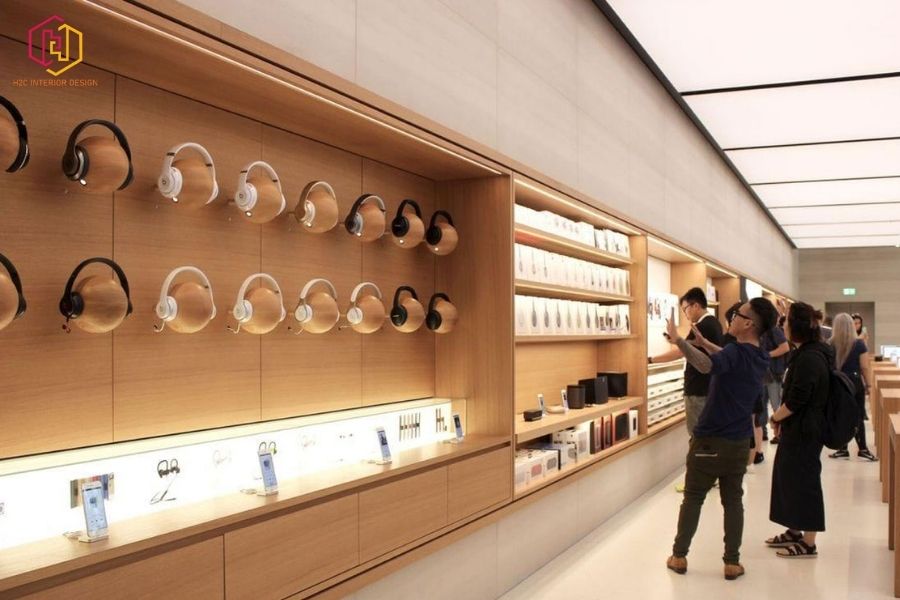 H2C trực tiếp sản xuất nội thất tại xưởng, sau đó thi công lắp đặt tại cửa hàng. Mọi công đoạn đều được kỹ sư giám sát chặt chẽ để đảm bảo đúng thiết kế và an toàn.