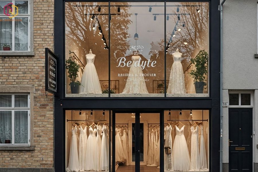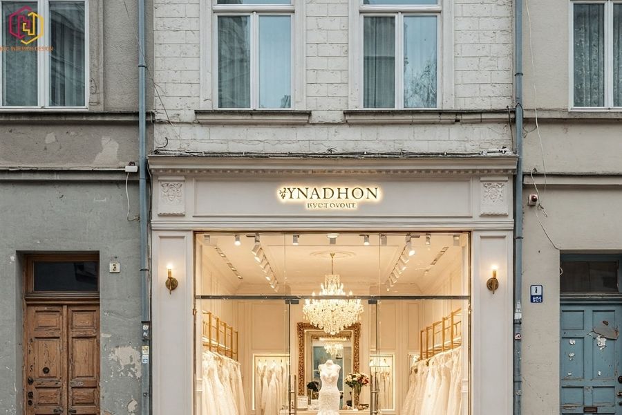 Cửa hàng nổi bật với mặt tiền kính lớn tối đa hóa ánh sáng tự nhiên và trưng bày, tạo sự sang trọng, hiện đại