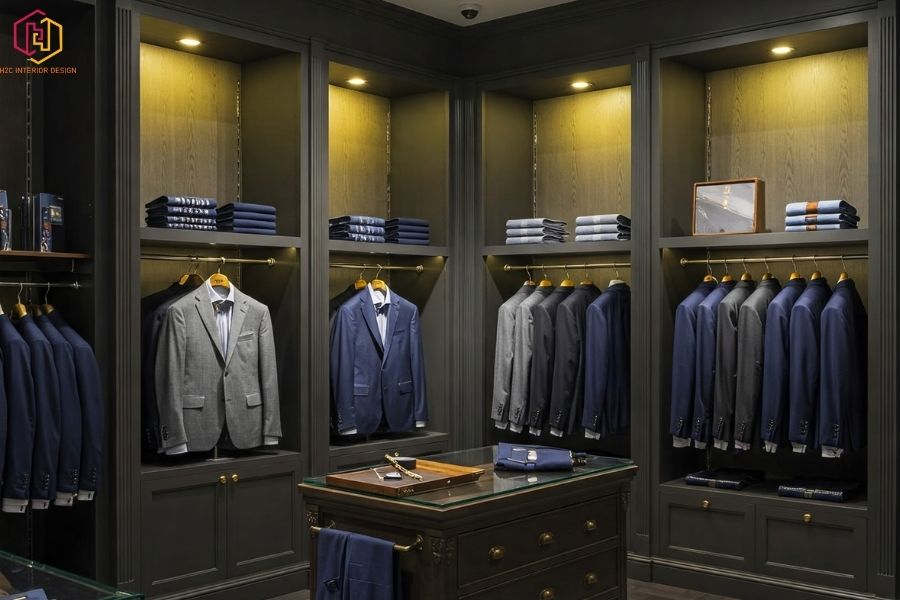 Khu trưng bày trang phục nam cổ điển, sang trọng, tạo cảm giác chuyên nghiệp và đẳng cấp.