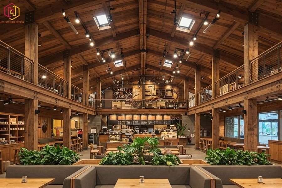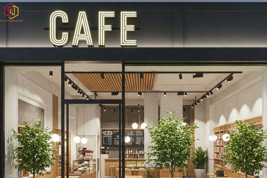 Mặt tiền kính lớn và bảng hiệu đèn neon nổi bật, nội thất gỗ ấm áp, kết hợp cây xanh tạo không gian gần gũi, thoáng đãng.