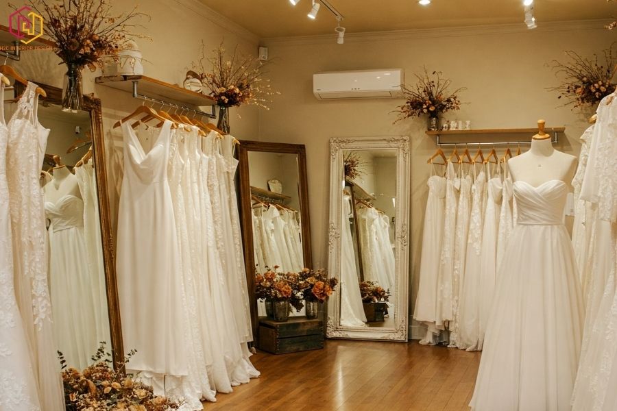 Không gian cửa hàng YNADHON rộng rãi, tràn ngập ánh sáng, tập trung trưng bày các bộ váy cưới sang trọng, cổ điển