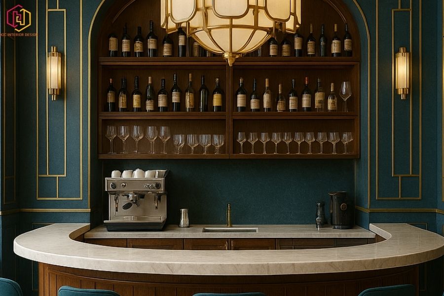 Quầy bar thiết kế phong cách Art Deco, bàn ghế tạo nên không gian sang trọng và cổ điển.
