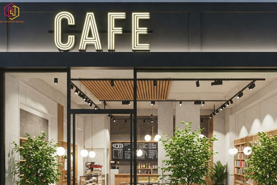 Thiết kế hiện đại, mặt tiền kính lớn và bảng hiệu đèn neon nổi bật, tạo không gian gần gũi, thoáng đãng.