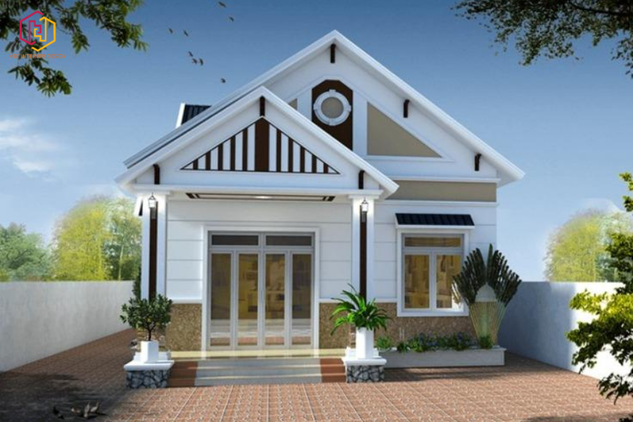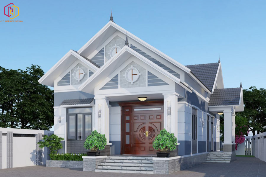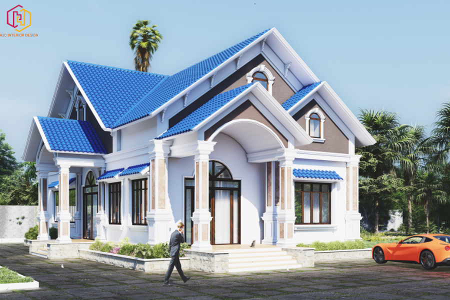 Diện tích 150m², thiết kế 3 phòng ngủ, sân trước rộng. H2C sử dụng mái ngói màu xanh, tường sơn trắng, tạo vẻ đẹp sang trọng, gần gũi.