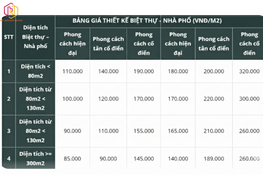 Lưu ý: Bảng giá trên mang tính tham khảo. Chi phí thực tế phụ thuộc diện tích, phong cách, chất liệu và mức độ yêu cầu của gia chủ.