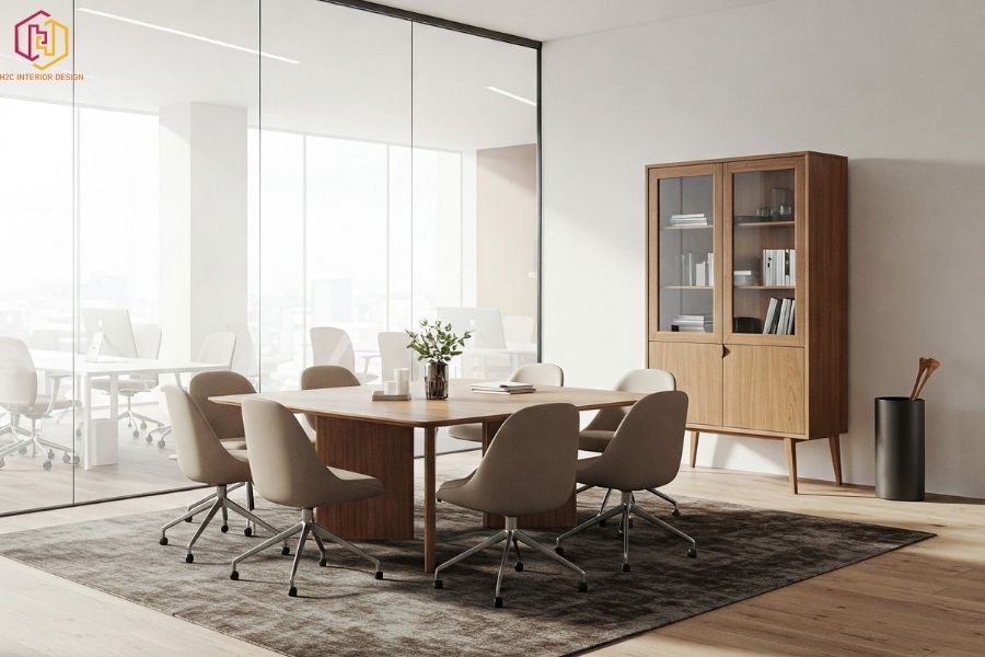 Phòng hội nghị thiết kế tạo không gian mở nhưng vẫn đảm bảo sự riêng tư, mang lại cảm giác chuyên nghiệp, thoải mái.