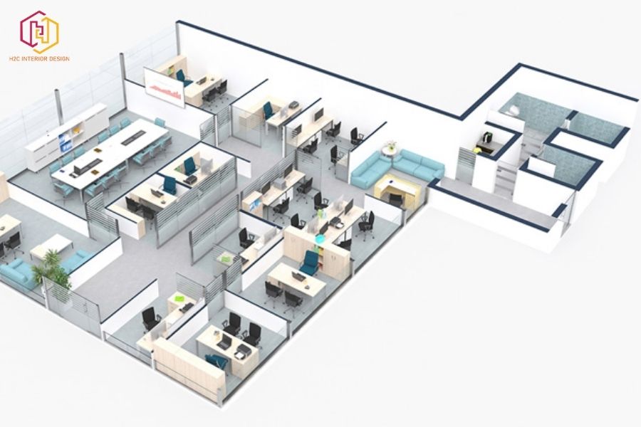 Thiết kế phương án 2D – 3D: H2C cung cấp bản vẽ mặt bằng và phối cảnh 3D để doanh nghiệp dễ dàng hình dung không gian thực tế.