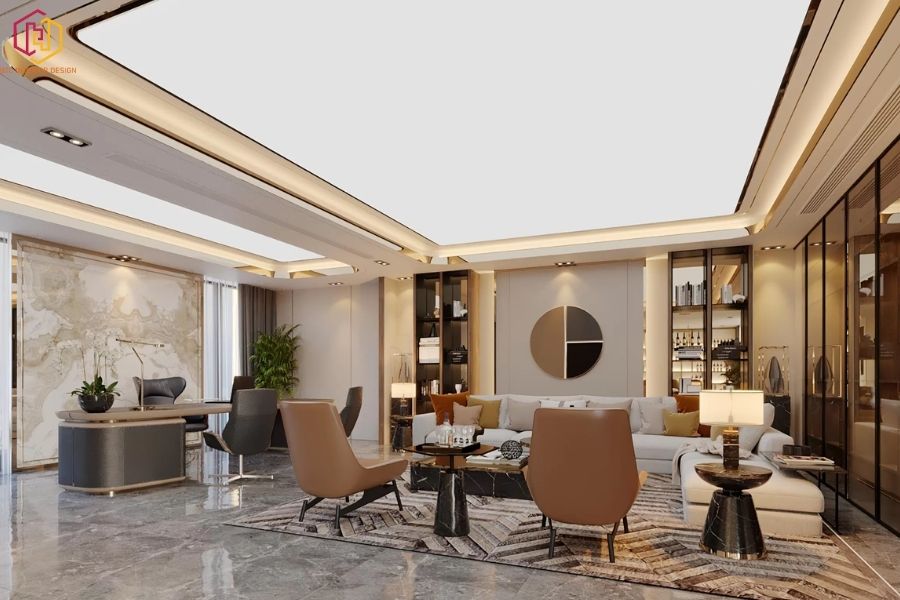 Phong cách Luxury (sang trọng) biến văn phòng thành một không gian đẳng cấp, thể hiện sự thành công và vị thế của doanh nghiệp. Phong cách này chú trọng vào việc sử dụng vật liệu cao cấp như gỗ tự nhiên quý hiếm, đá ốp marble, kính cường lực và các chi tiết kim loại ánh vàng. Nội thất được chế tác tinh xảo, tỉ mỉ, mang lại vẻ đẹp quyền lực và sang trọng. Hệ thống ánh sáng được bố trí chuyên nghiệp, không chỉ để chiếu sáng mà còn để tạo điểm nhấn cho không gian. Một văn phòng theo phong cách Luxury không chỉ là nơi làm việc mà còn là công cụ hữu hiệu để tạo ấn tượng mạnh mẽ với đối tác và khách hàng, đồng thời khẳng định giá trị thương hiệu. Phong cách này phù hợp với các doanh nghiệp lớn, các tập đoàn tài chính, luật hoặc các công ty trong ngành hàng xa xỉ.