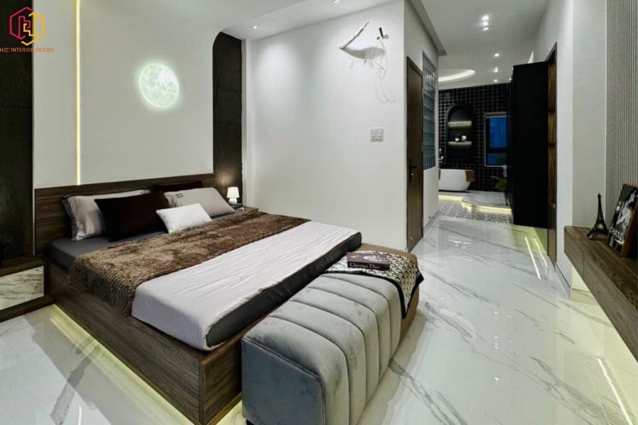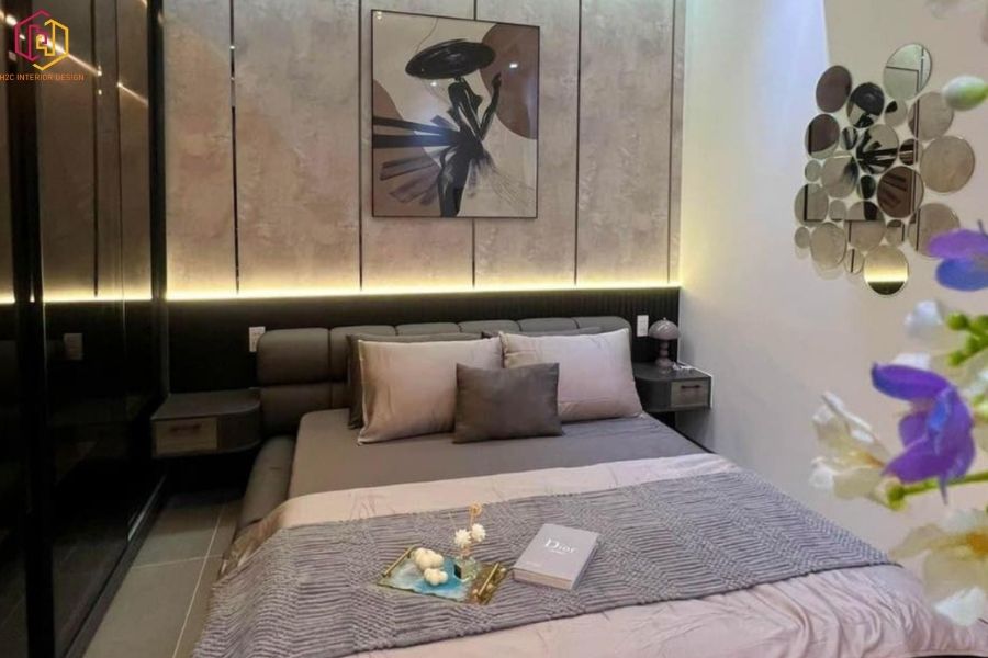 Phòng ngủ được thiết kế hiện đại, ấm áp và độc đáo, nội thất mang lại vẻ sang trọng cho căn phòng.