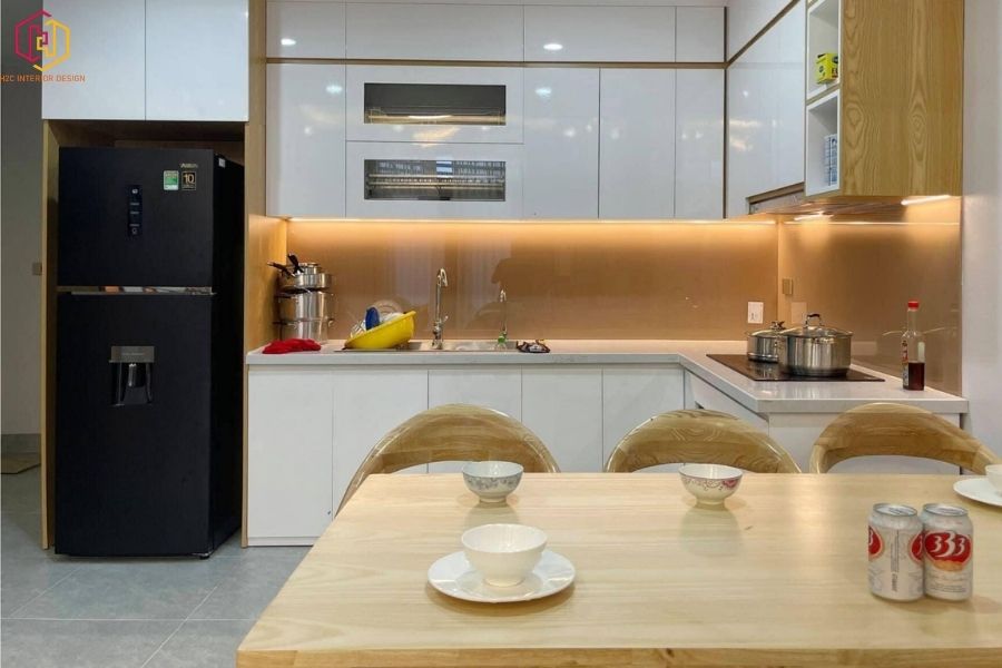 Không gian bếp và bàn ăn được thiết kế hiện đại, tạo một không gian ấm cúng, sang trọng và tiện nghi cho gia đình.