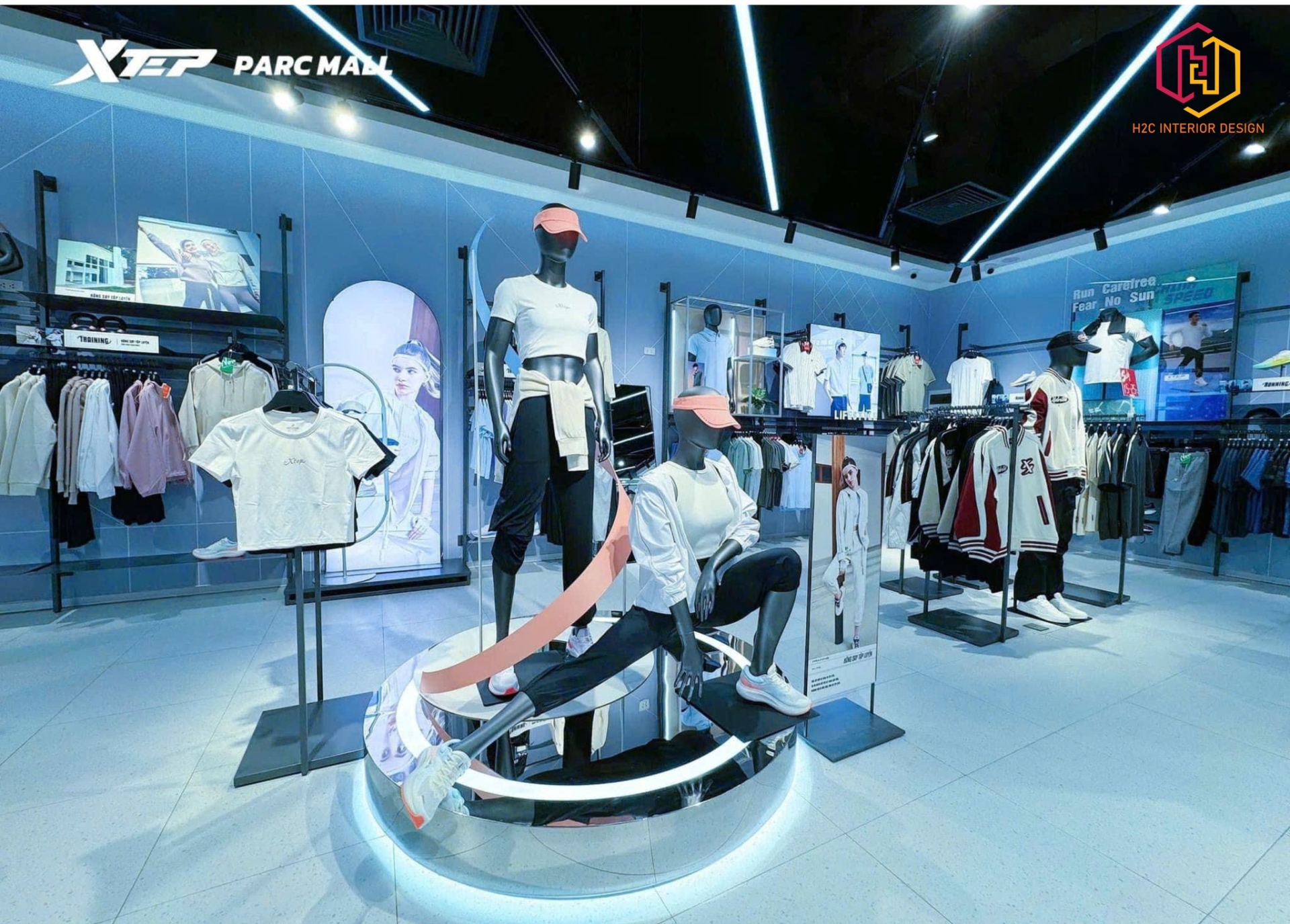Hình ảnh bên trong cửa hàng Xtep Parc Mall, cho thấy cách bố trí sản phẩm thể thao năng động và thu hút. Không gian được thiết kế tập trung vào trải nghiệm khách hàng, nổi bật qua cách trưng bày manocanh ấn tượng