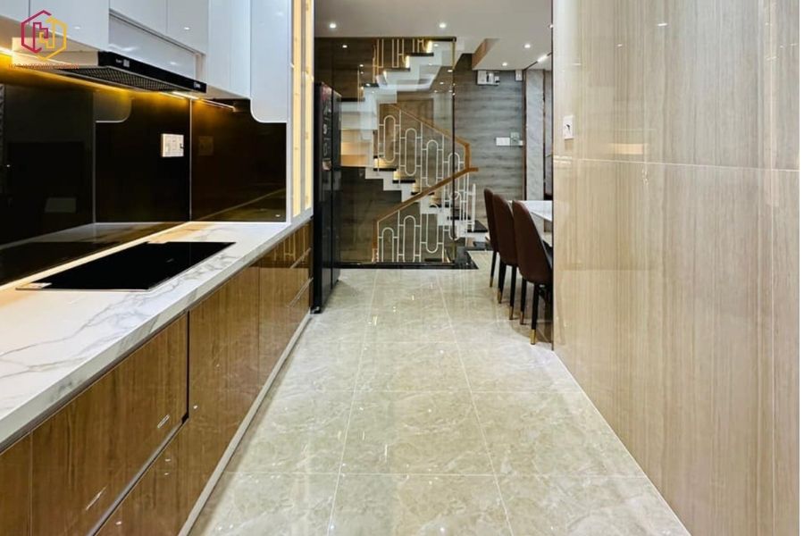 Khu vực bếp được thiết kế hiện đại và tiện nghi, nổi bật với hệ tủ bếp gỗ và tủ kính có đèn chiếu sáng bên trong. Trần nhà thạch cao uốn lượn với đèn âm trần tạo không gian ấm cúng và sang trọng