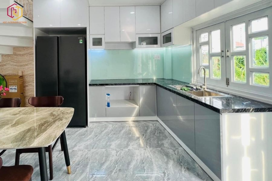 Phòng bếp hiện đại với tủ bếp màu trắng và xám bóng, thiết kế tối ưu công năng sử dụng. Bàn ăn mặt đá vân mây và hệ thống đèn thả trần tạo điểm nhấn ấm cúng cho không gian.