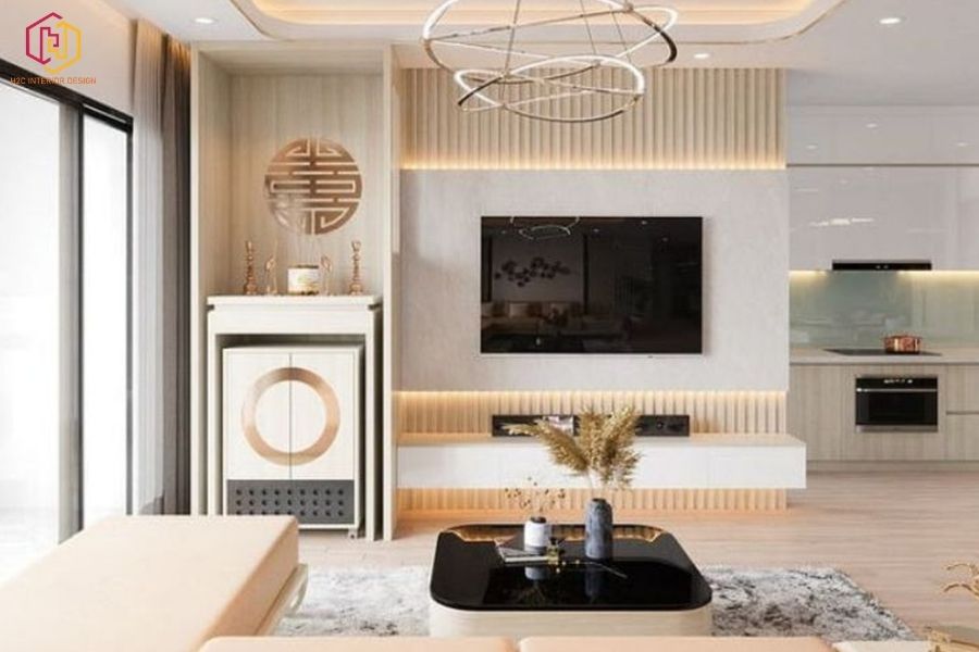 Bố trí sofa, kệ tivi, tủ trang trí phù hợp diện tích, tạo điểm nhấn thẩm mỹ cho không gian sinh hoạt chung.