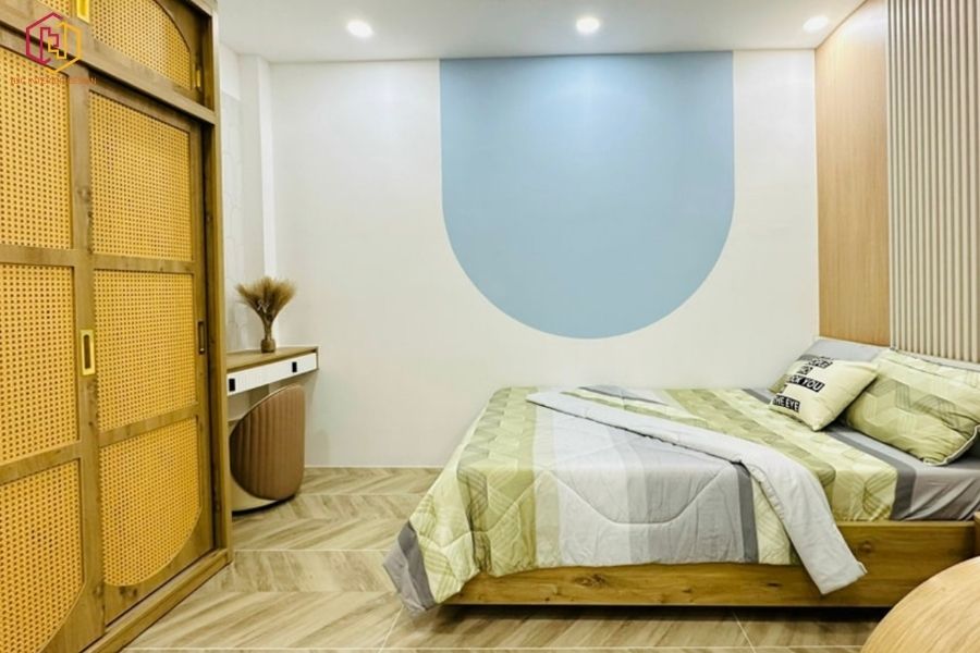 Phòng ngủ hiện đại với thiết kế tường nhấn nhá họa tiết vòng cung màu xanh pastel và hệ thống đèn trần hắt sáng. Giường gỗ và tủ quần áo lớn với cánh cửa đan mây tạo nên không gian nghỉ ngơi tiện nghi và thẩm mỹ
